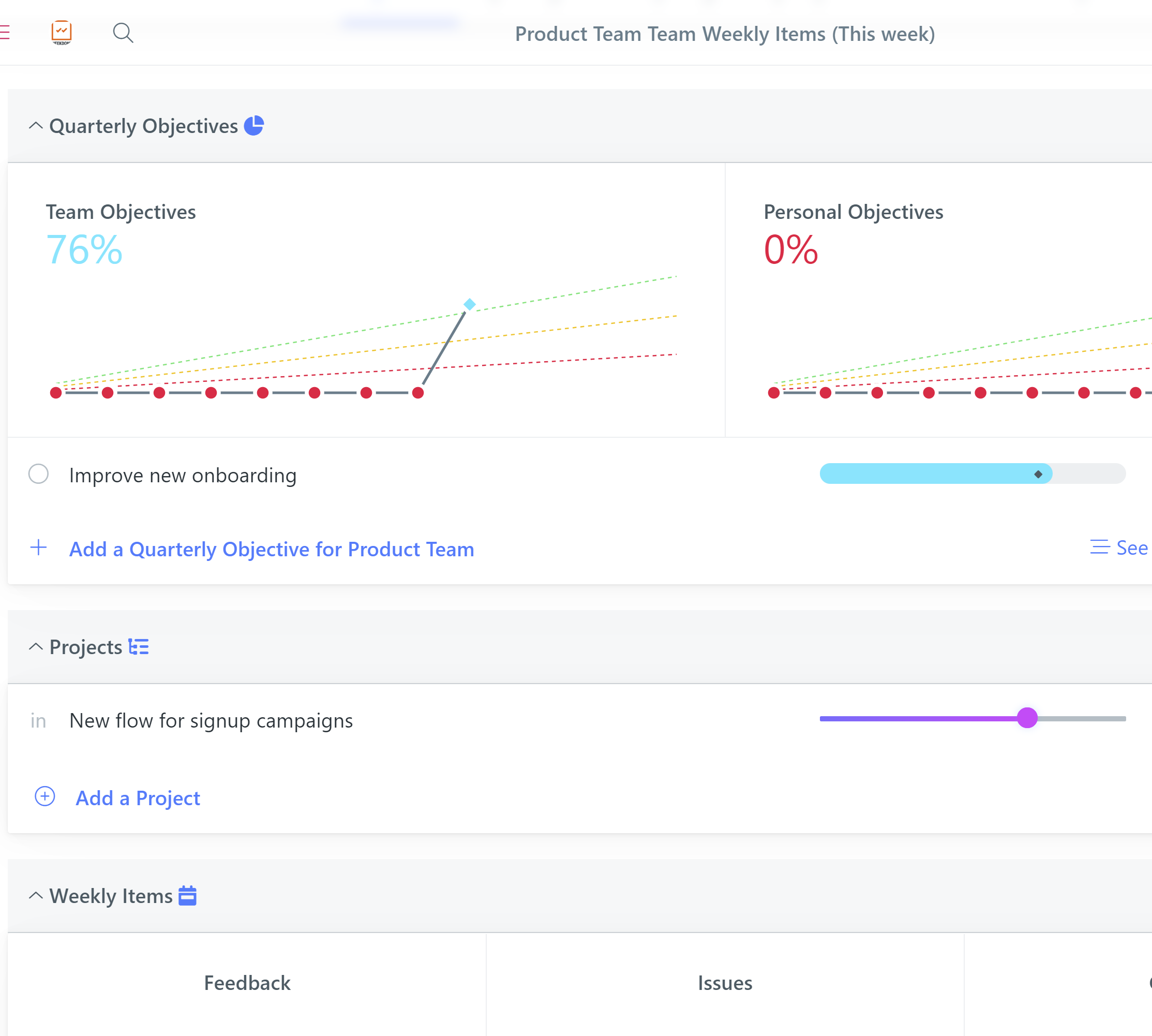 • Quarterly Objectives and Projects progress % color-coded for hitting that week's expectation